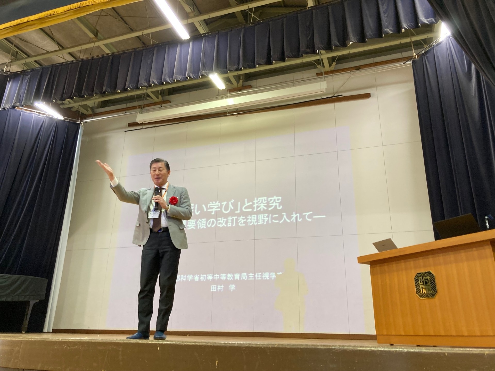 本日は国語科、数学科、音楽科、美術科、家庭科、総合的な学習の公開授業・研究協議会が行われました。また、文部科学省主任視学官・田村学先生より『「深い学び」と探究』の演題で全体講演をいただきました。