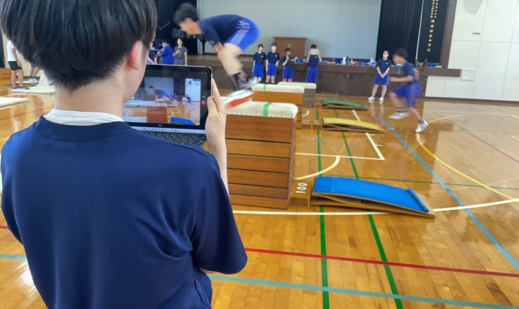 今日の授業は器械運動。テーマは「なめらかで安定した演技!」です。テーマに沿ったより良い演技にするために、タブレットで自分の演技を友達に撮影してもらい...