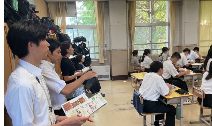 2年生の保護者会をオンラインで実施しました。配信元の学校では、広い教室に学年職員が集まっています。「10月に実施する企業訪問について」と「卒業後の進...