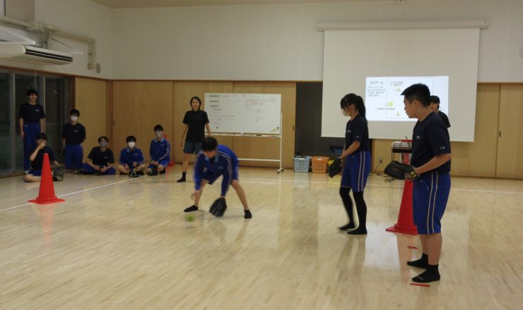 台風の影響でグラウンドを使えないため、多目的ホールでソフトボールの授業を行っています。カラーコーンをベースに見立て、打者が転がしたボールをキャッチし...