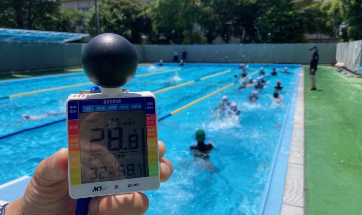 今週から体育で水泳が始まりました。今日も絶好のプール日和です。11時現在のプールサイドの気温は32.4℃、WBGT計は28.8を示していました。安全...