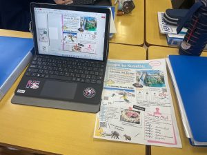 前もって聞き取ったサム先生の情報をもとに、冬休みに先生一家が旅行に行く際のプランを考え、その提案資料をグループで作成していました。旅行雑誌などと比較しても遜色ない素晴らしいものになっていますね。