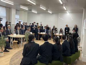 長い間工事をしていた旧第2理科室の場所に「Fyラウンジ」が完成し、本日関係者に対してお披露目会が開催されました。このラウンジは、全校生徒の思いを多くの大人たちが支援し、一緒に作り上げたものです。
