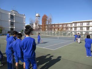 3年生の保健体育は選択制です。澄み渡る青空の下、テニスの授業は最高に楽しいです。トスされたボールをよく見て足を動かし、立ち止まってラケットを振りぬきます。留学生会館にホームランを打たないようにね。