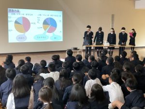 3年生最後の学年集会が開かれました。余興のコーナーでは自身の才能を披露する場面があり、残されたみんなとの時間を思いっきり楽しんでいました。「未成年の主張」では告白もあり、悲鳴が響いていました。